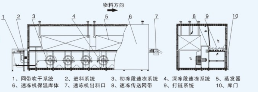1、機型結構 采用歐洲最成熟的機型,結構合理,對不同的產品形狀和尺寸均能達到最佳的速凍效果。
